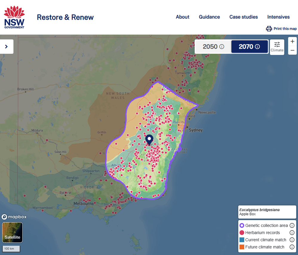 Luckily, with the Restore & Renew (R&R) webtool, we now have information at hand to make sure we are maximising genetic diversity as well as minimising the risk of 'outbreeding depression'—where bringing together genetics that are too different can actually reduce a plant’s fitness. There are currently 100 species on the R&R webtool. While we only grow about 40 species in our nursersies, around a quarter of those—including most of our Eucalypts—are covered by the tool.